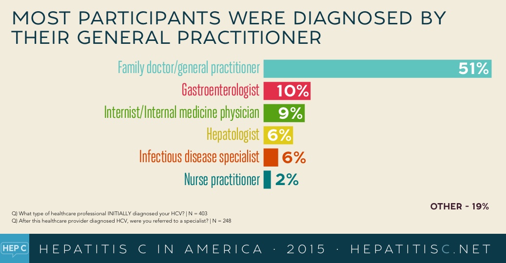 The majority of respondents were diagnosed with hepatitis C by their general healthcare practitioner. Upon receiving a diagnosis, the most respondents were referred to a specialist within 3 months.