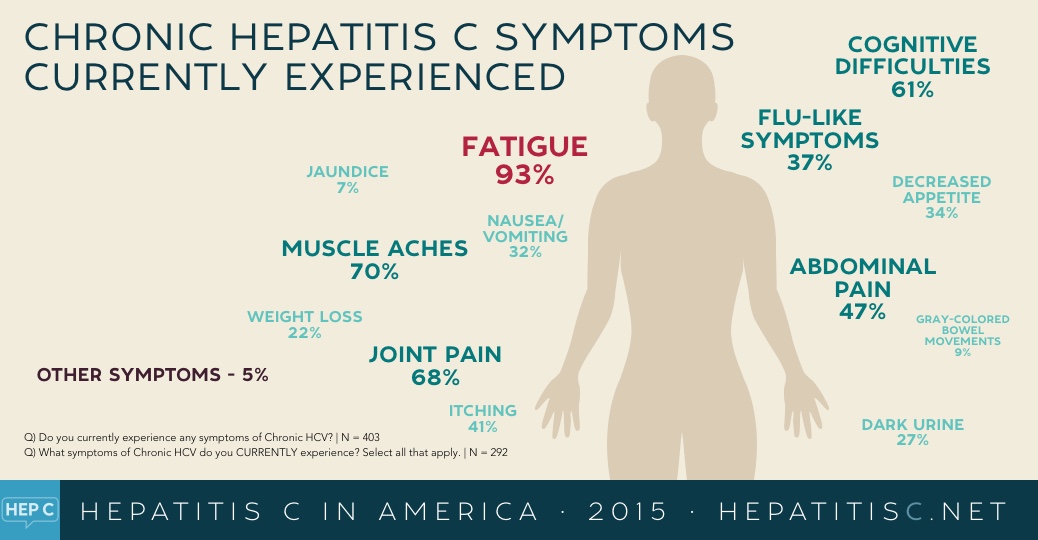 The majority of respondents reported that they currently experience chronic HCV symptoms, with fatigue being the most common symptom. Muscle aches, joint pain, and cognitive issues also occurred in more than half of respondents.