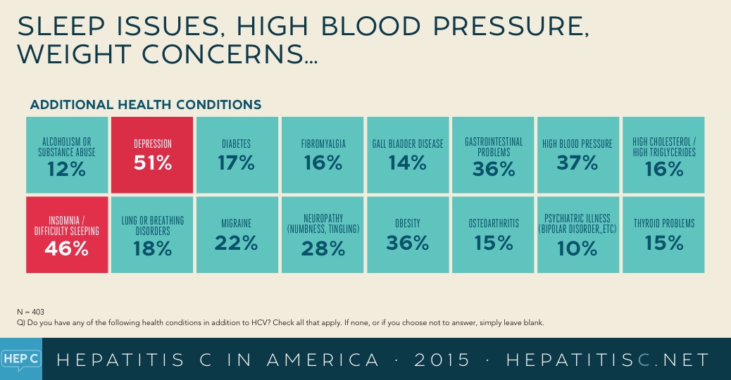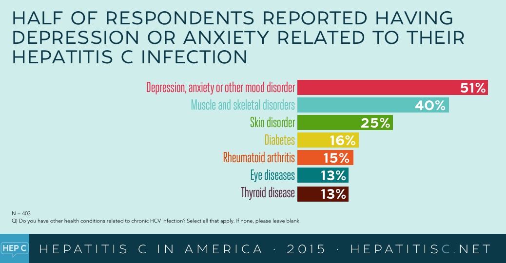 Depression and anxiety are commonly reported in people with hepatitis C. In addition to these conditions, respondents also reported experiencing muscle and skeletal disorders like arthritis and loss of bone density, and skin disorders, such as purple spots and severe itching.