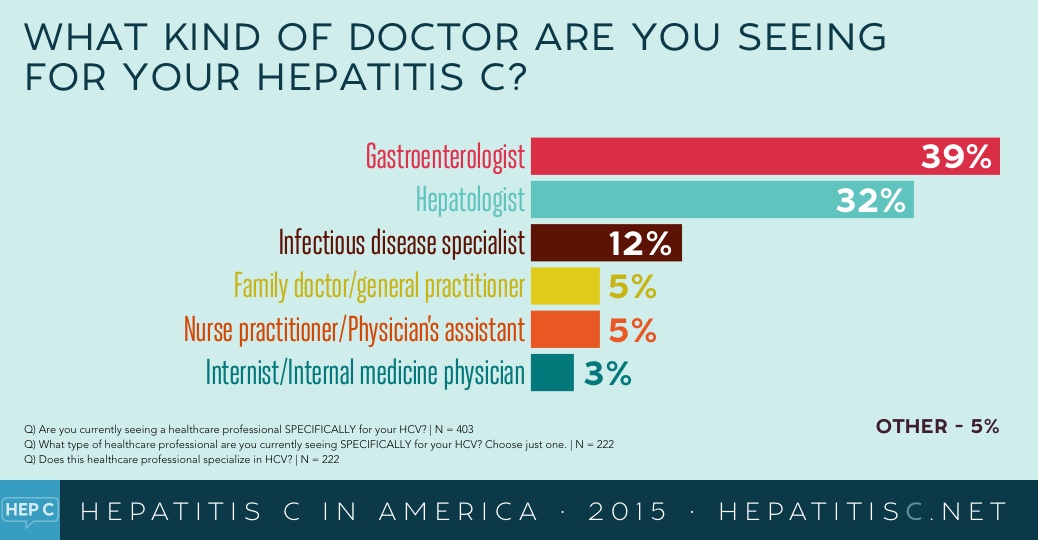 A total of 55% of respondents said they see a health care provider specifically for their HCV, and the majority of those providers specialize in hepatitis C. Most of those who are receiving care for their hepatitis C were being treated by a gastroenterologist or a hepatologist.
