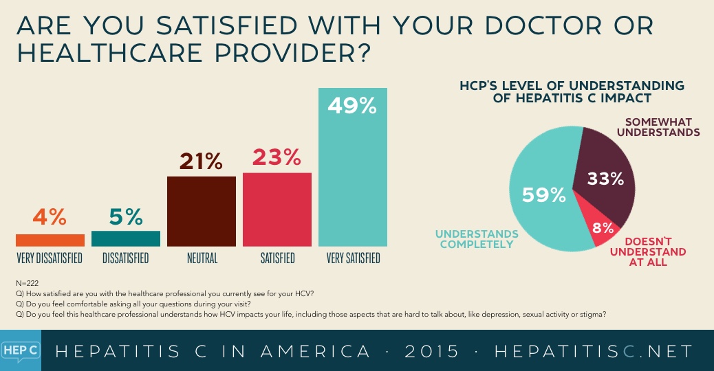 The majority of respondents who see a health care provider for their hepatitis C noted that they are satisfied with that provider. Most respondents also felt comfortable asking their healthcare provider questions during their visits, and noted that they feel like their HCP does understand the overall impact hepatitis C has on a person’s life.