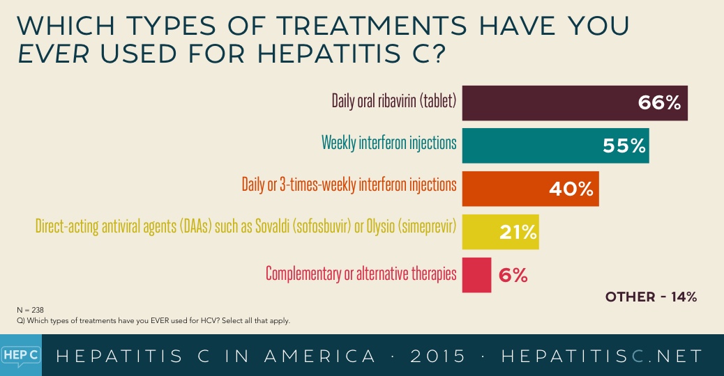 Daily ribavirin tablets or weekly interferon injections were the most common hepatitis treatments ever used by respondents. Other treatments used included daily or 3 times weekly interferon injections, direct acting antiviral agents, and complimentary or alternative therapies.