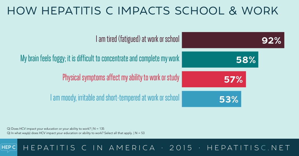 A total of 39% of those who work or go to school said that hepatitis C impacts their education or ability to work, with fatigue being the biggest factor. More than half of those who feel hepatitis C impacts work or school said that they have trouble concentrating, they have physical symptoms that impact their abilities, or they feel moody or irritable.